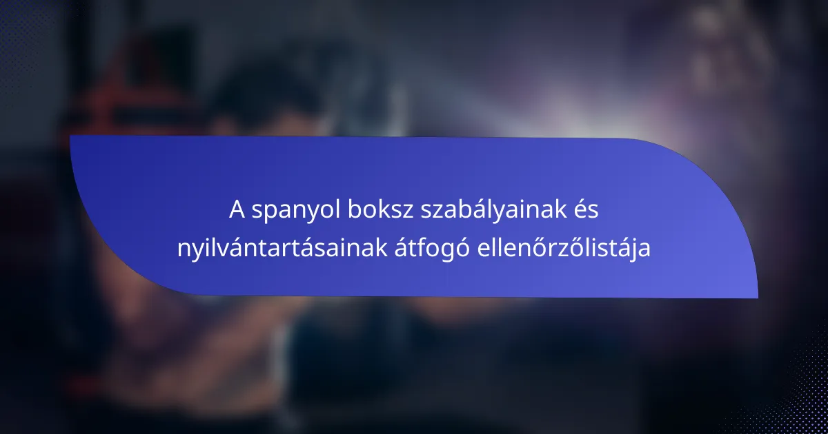 Ez a részletes ellenőrző lista a spanyolországi bokszra vonatkozó kulcsfontosságú szabályozásokat és nyilvántartásokat vázolja fel, amelyeket elsősorban a Spanyol Boksz Szövetség (FEB) állapított meg. Tartalmazza a licencelés, súlycsoportok, biztonsági protokollok és bírói kritériumok lényeges aspektusait, biztosítva ezzel a tisztességes versenyt és a résztvevők biztonságát. Ezenkívül kiemeli, hogyan tartják fenn a hivatalos szervezetek a bunyósok teljesítményének pontos nyilvántartását, amely létfontosságú a rangsorolás és a történelmi kontextus szempontjából.